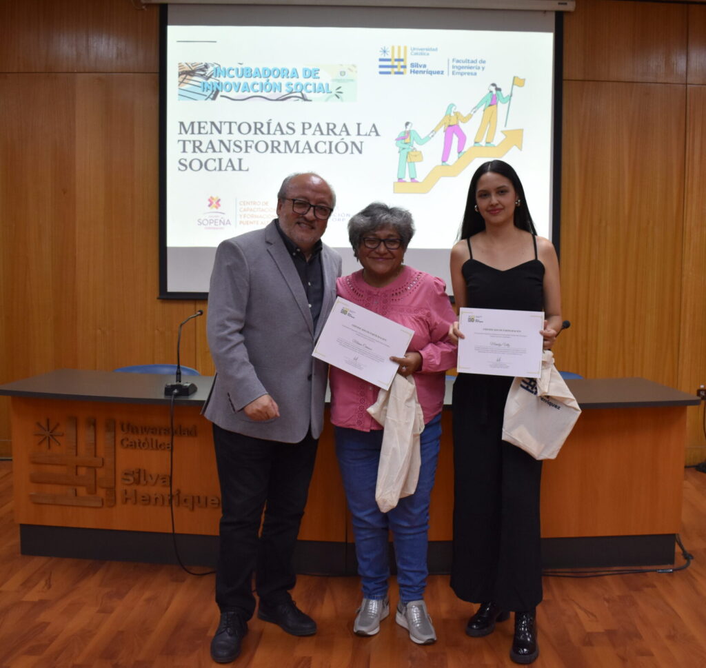 Asistieron también las emprendedoras, a quienes se certificó por su participación y compromiso durante el acompañamiento y se hizo una entrega simbólica del premio a aquellas que adjudicaron el fondo concursable. Además, se reconoció a quienes lideraron los talleres durante el proyecto: Annais Campos y Katherine Arriagada, Profesionales PACE; Gustavo Albornoz, Pastoral Universitaria; María Paz Mateluna, Comunicaciones UCSH; y María Elena Moreno, Facultad de Ingeniería y Empresa.
